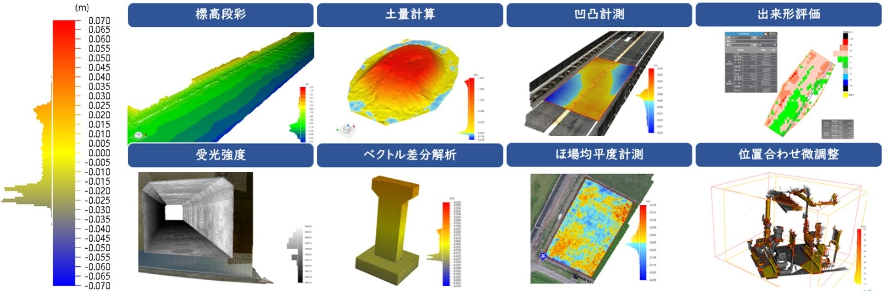 また、ベクトル差分解析(オプション)や、ヒートマップにヒストグラムをプラスした視認性の高い定量評価機能など、施工業向けの機能も大幅に拡充しており、調査・測量から設計・施工・維持管理までの幅広いシーンにおいて、3D点群の活用による生産性向上を支援して参ります。