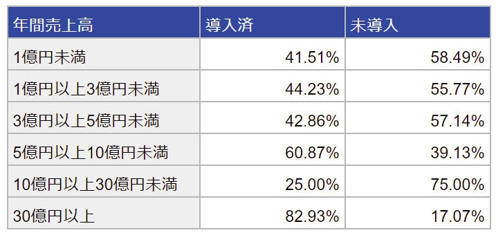 売上高30億円未満では顕著な傾向は見られなかったものの、30億円以上の企業では82.3%と高い導入率が見受けられました。