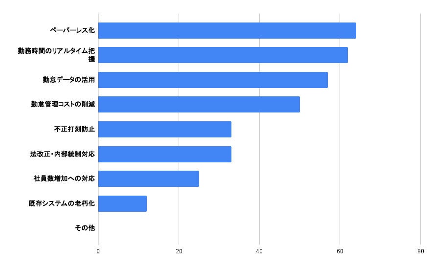 もっとも回答が集まったのが、「ペーパーレス化」で47.7%の方が選択しました。次いで「勤務時間のリアルタイム把握」で46.2%の方が選択しました。