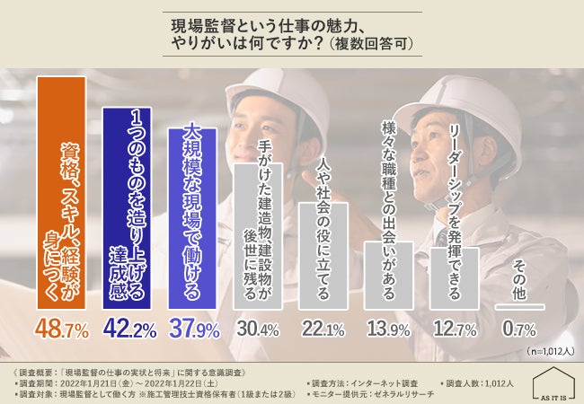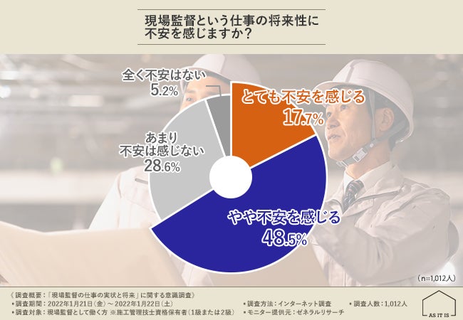 そこで今回、「あるがままに自由で豊かな暮らしを提供したい」つくば・渋谷・水戸の工務店『株式会社AS IT IS』(https://asitis.ibaraki.jp/)は、現場監督として働く方※施工管理技士資格保有者(1級または2級)を対象に、「現場監督の仕事の実状と将来」に関する調査を実施しました。