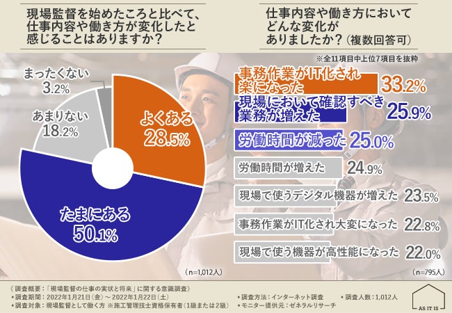 そこで、「現場監督を始めたころと比べて、仕事内容や働き方が変化したと感じることはありますか?」と質問したところ、7割以上の方が『よくある(28.5%)』『たまにある(50.1%)』と回答しました。