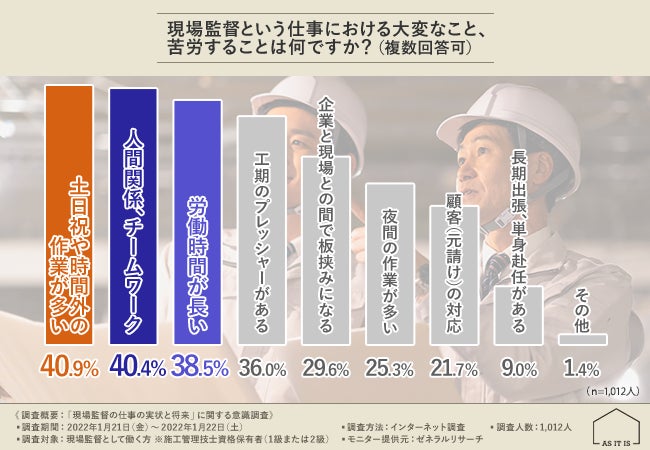 そこで、「現場監督という仕事における大変なこと、苦労することは何ですか?(複数回答可)」と質問したところ、『土日祝や時間外の作業が多い(40.9%)』と回答した方が最も多く、次いで『人間関係、チームワーク(40.4%)』『労働時間が長い(38.5%)』と続きました。