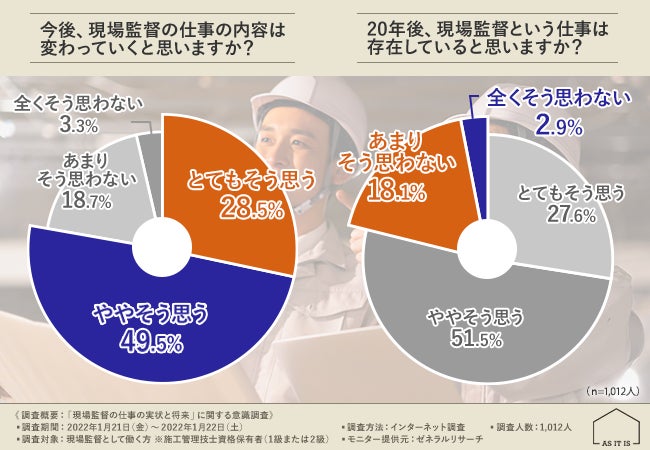 そこで、「今後、現場監督の仕事の内容は変わっていくと思いますか?」と質問したところ、7割以上の方が『とてもそう思う(28.5%)』『ややそう思う(49.5%)』と回答しました。