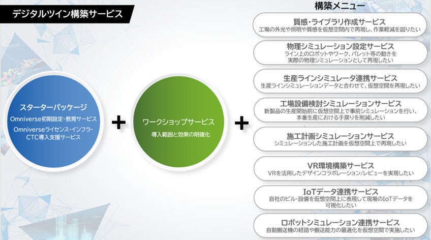 CTCには既に、Omniverseを利用したデジタルツイン環境の構築実績があり、業務課題の整理からサービスメニューの選択、環境構築、運用・保守、トレーニングまでのサービスを一貫して提供します。