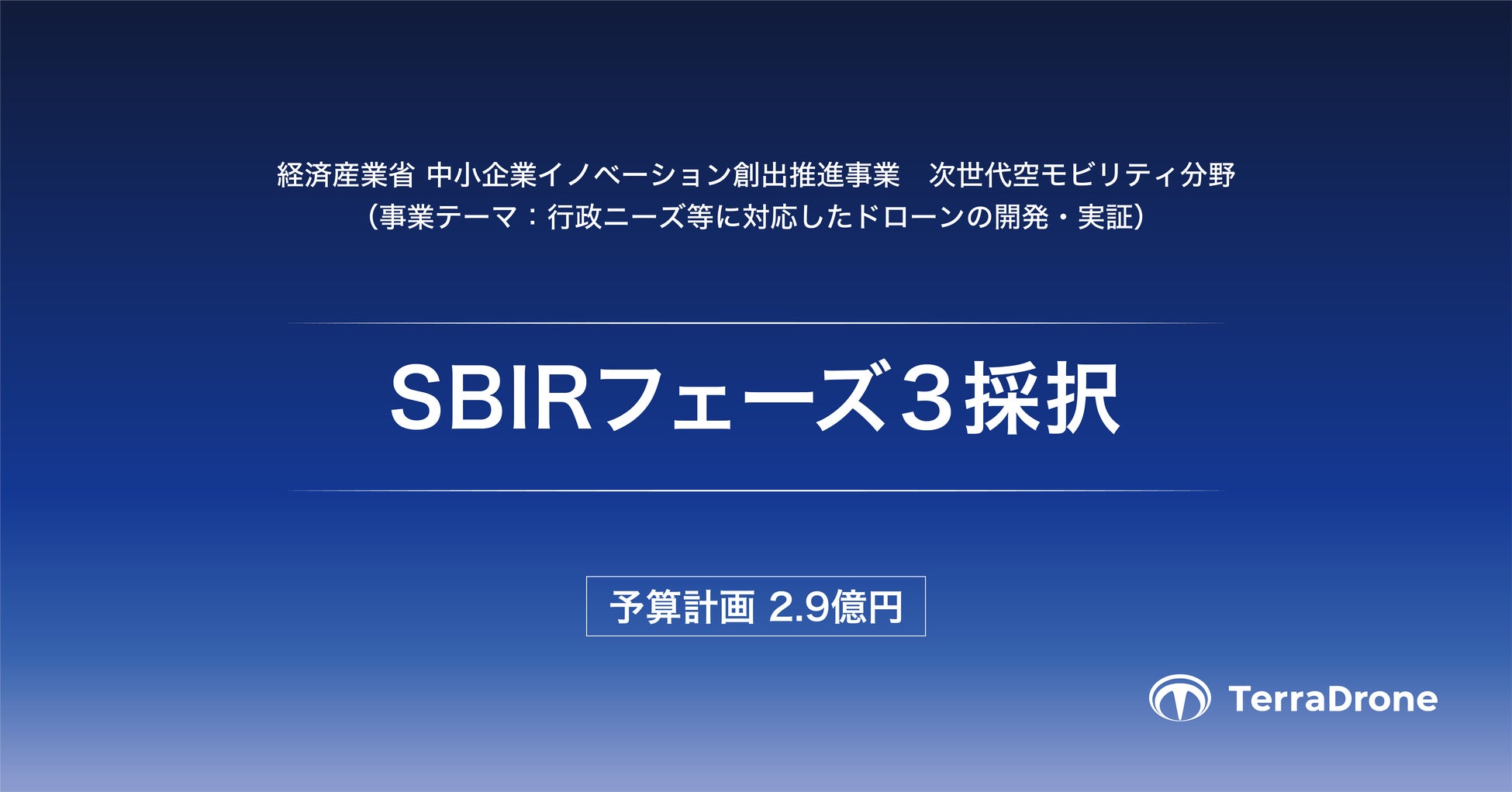 Terra Drone株式会社(本社:東京都渋谷区、代表:徳重 徹、以下 テラドローン)は、経済産業省の「中小企業イノベーション創出推進事業(SBIR: Small Business Innovation Research)フェーズ3」の次世代空モビリティ分野(事業テーマ:行政ニーズ等に対応したドローンの開発・実証、以下 本事業)に採択(※1)されました。