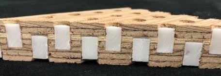 - タブレット状の難燃薬剤を国産合板の表裏両面から一定間隔で埋め込み耐火性能を持たせた合板。