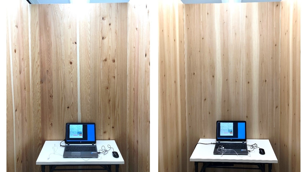 - ブースの材質が木材、木目調シートどちらの場合も「本物の木材であると認知する」ことで疲労抑制効果があること、材質の認知が木材、木目調シートどちらの場合も「本物の木材」という材質に疲労感抑制効果があることを実証した。