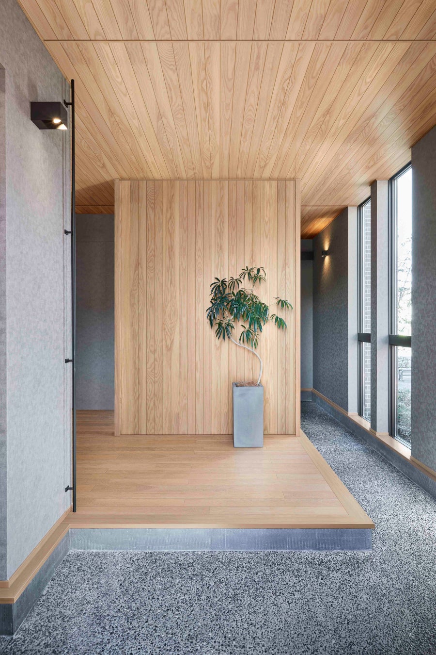 - 多摩産スギを異なる太さの材としクロスに組み合わせた格子状のデザインで、上智大学の建学の理念である「多様性」「対話」「他者との交流」「真理」「伝統」を表現。