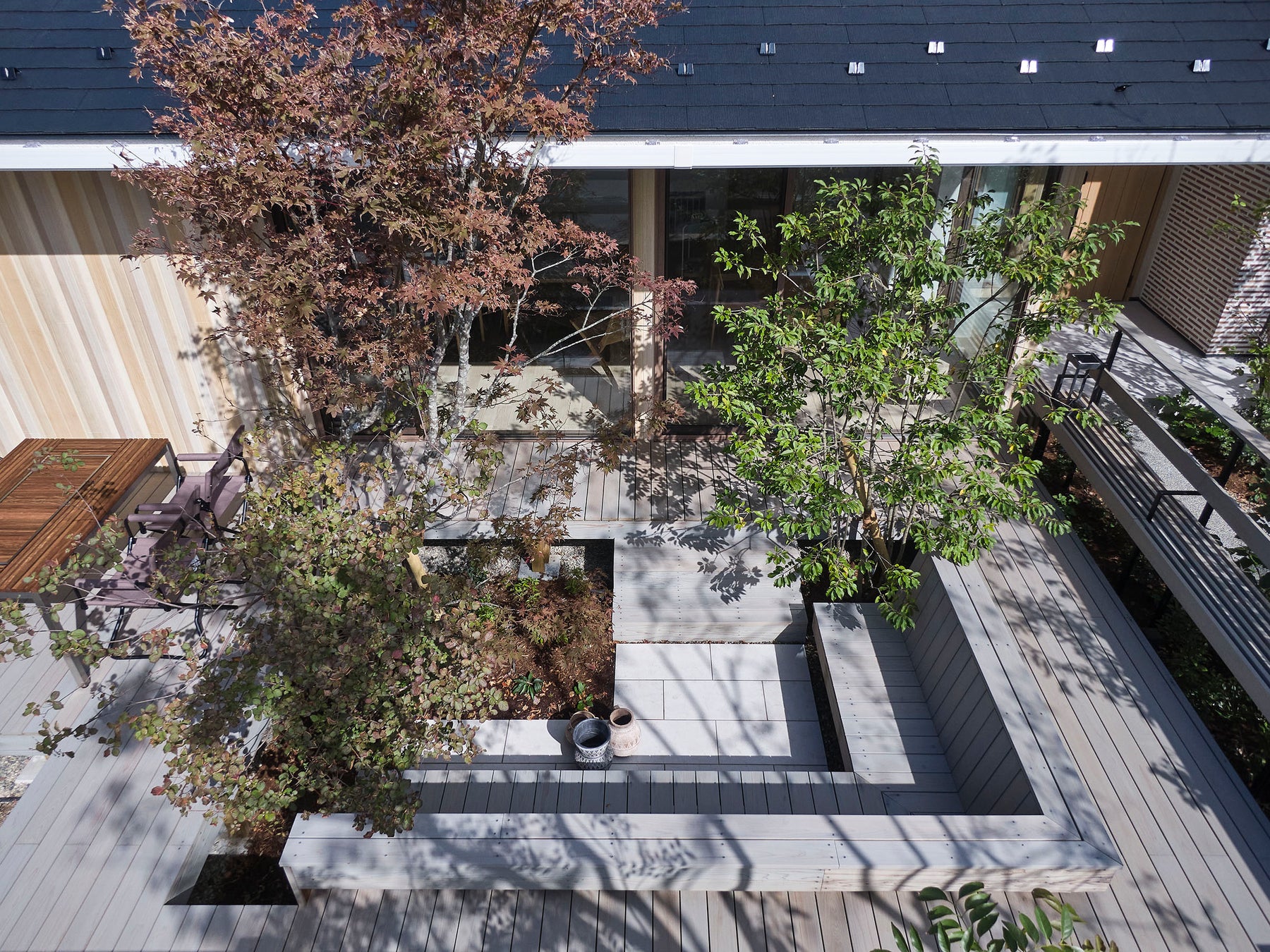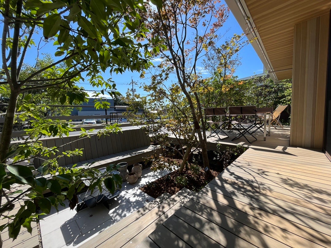 - ウッドデッキには国産ヒノキ三面上小節材を使用。表面はビスを無くし、経年によるささくれを防ぐなど安全面にも配慮。