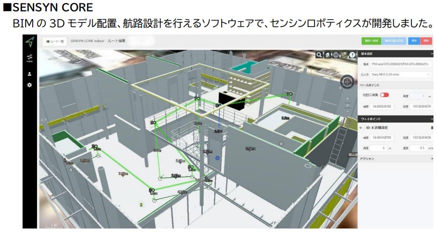 「BIM×Drone」は、「SENSYN CORE」を使いVisual SLAM[※3]技術を利用した機体の飛行指示に、BIMや3Dモデルから作成したマップをルート設計に活用することができ、BIMデータを変換、3Dマップ表示することで、高さも含めて視覚的にわかりやすいルートの設定が可能です。