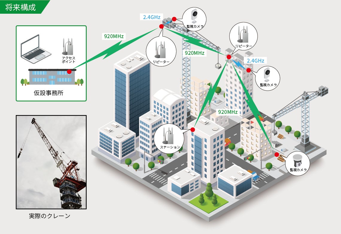 検証機器は、株式会社フルノシステムズ(本社:東京都墨田区)が開発・販売しているIoTゲートウェイ対応11ahアクセスポイント「ACERA 330」を選定、タワークレーンから地上まで距離400mを想定し、カメラ映像の伝送検証を実施しました。