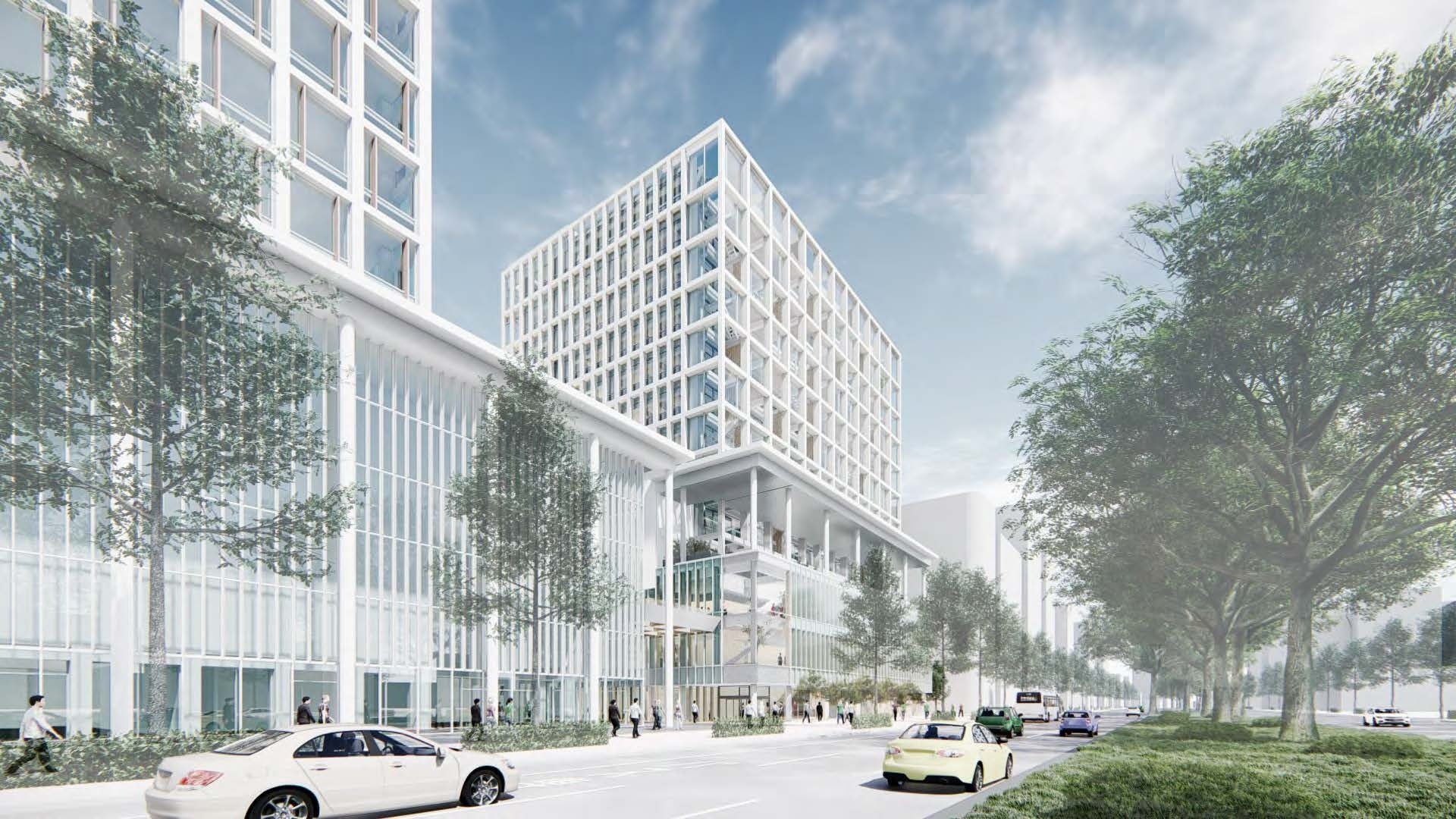 「けやき大通り」沿いからのイメージ。手前に「北國銀行本店」。けやき大通りに面するテラスが「庇」として機能し環境性能の向上に寄与。