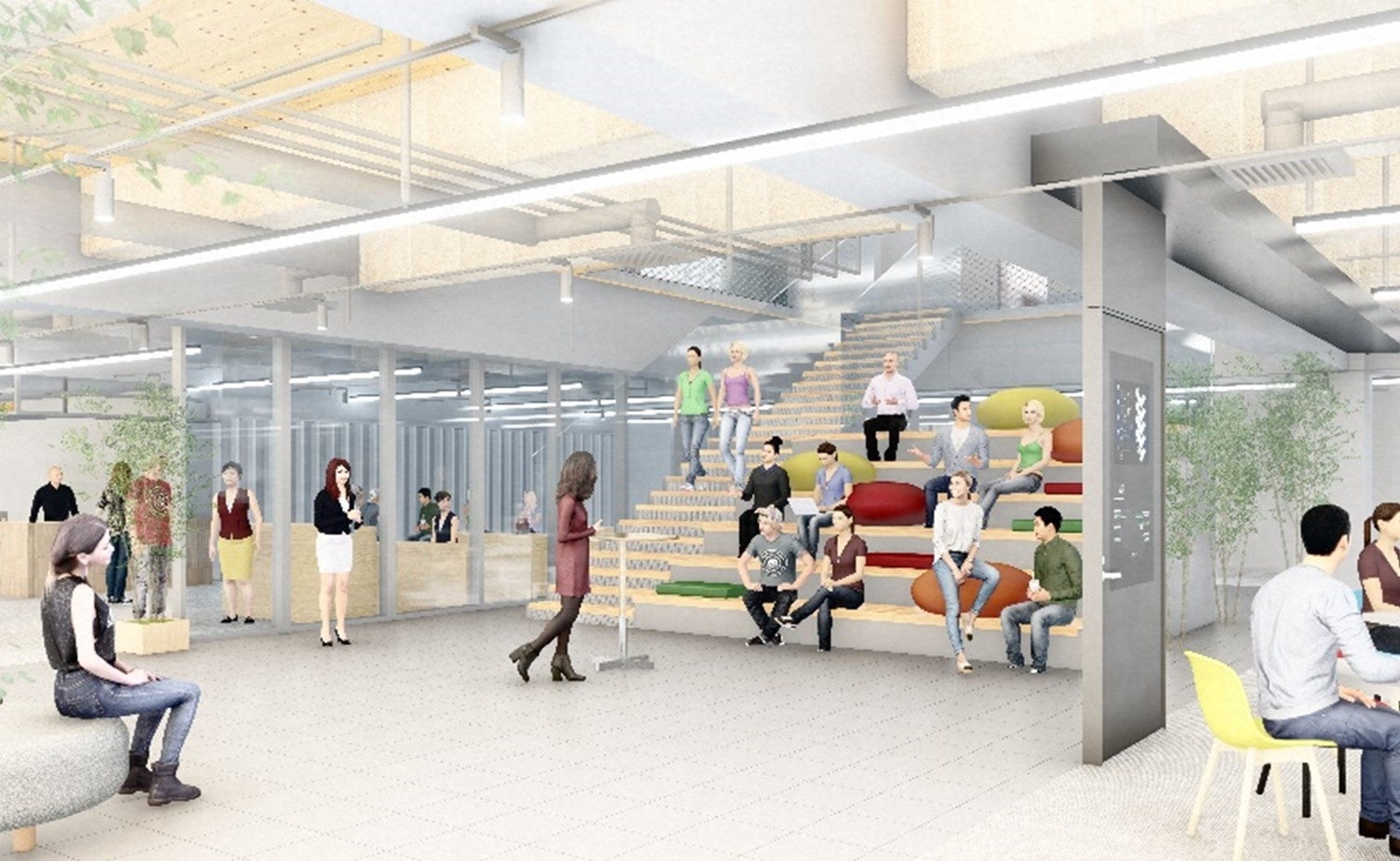 シェアオフィス(4階)共有ラウンジ…上階のコンクリート床の裏面に「MIデッキ」を使用。型枠がそのまま仕上げとなり、天井材なしで美観を確保できることから、天井高さも高くなり、快適性の向上に寄与します。