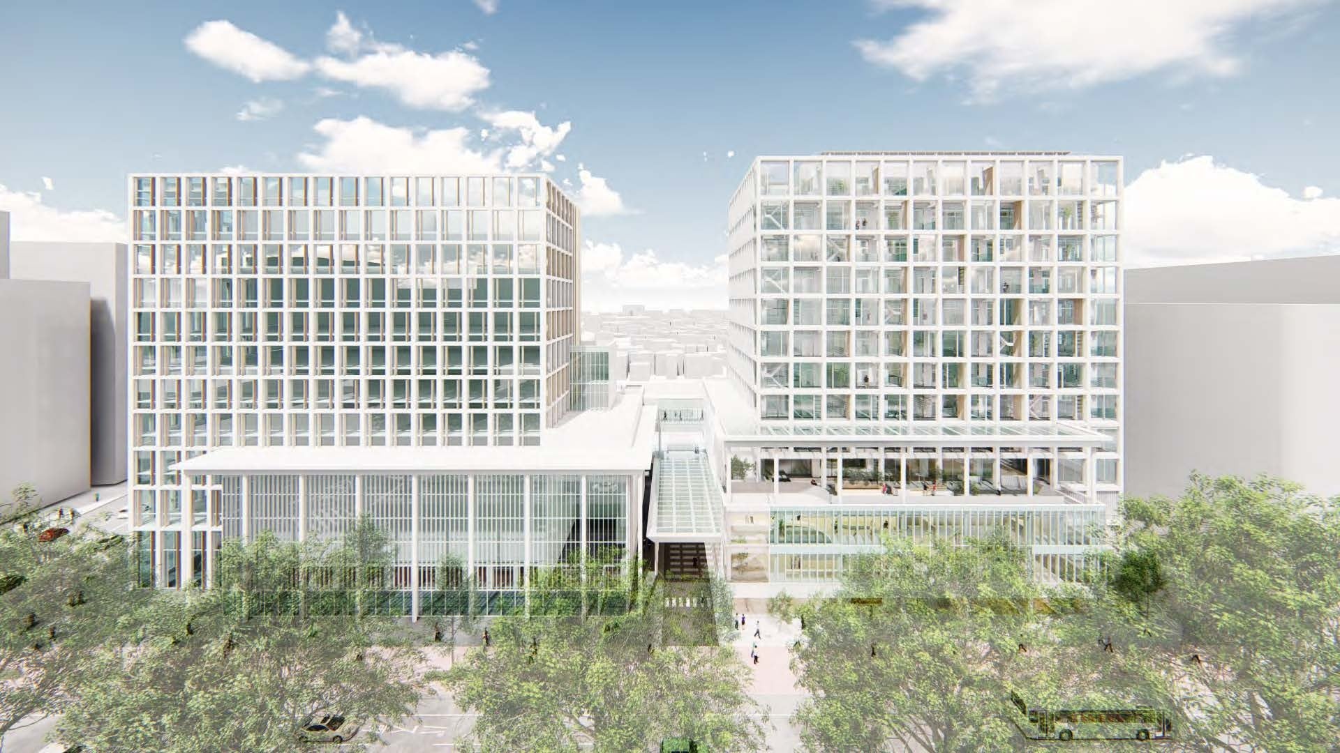 竣工イメージ。「Hirooka Terrace」(右)と「北國銀行本店」(左:2014年竣工、設計監理:三菱地所設計)。