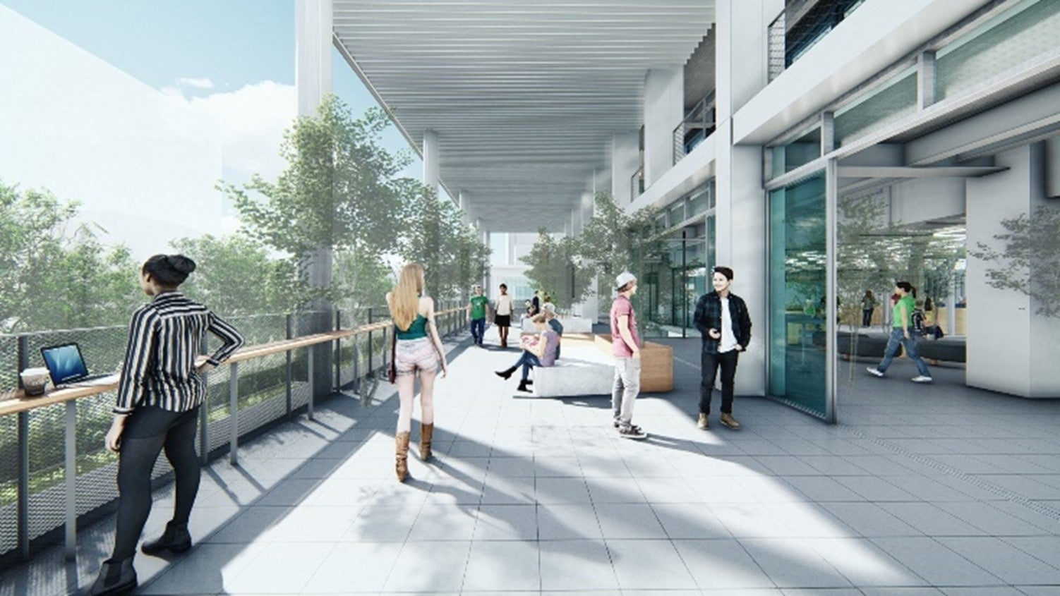 けやき大通りに面して半屋外空間「ケヤキテラス・モクテラス」を配置し、緑豊かな周辺環境への眺望を確保するとともに、オフィス専有部への日射遮蔽の役割を果たすことで、高性能外装との組み合わせにより空調への依存度を低減します。