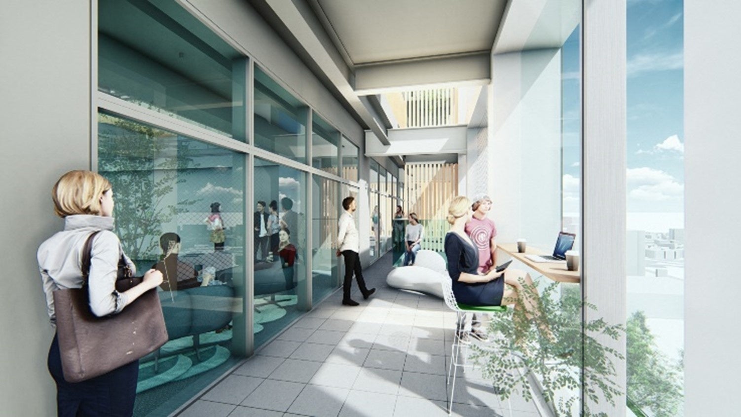 環境性能の向上に大きく寄与する「ケヤキテラス・モクテラス」は、入居テナントや地域の方々のための交流スペースとして機能します。また各階に設けられたラウンジや低層部に広がる交流空間、13階のスカイテラスなど、建物各部に交流を促す多様な居場所を計画しています。