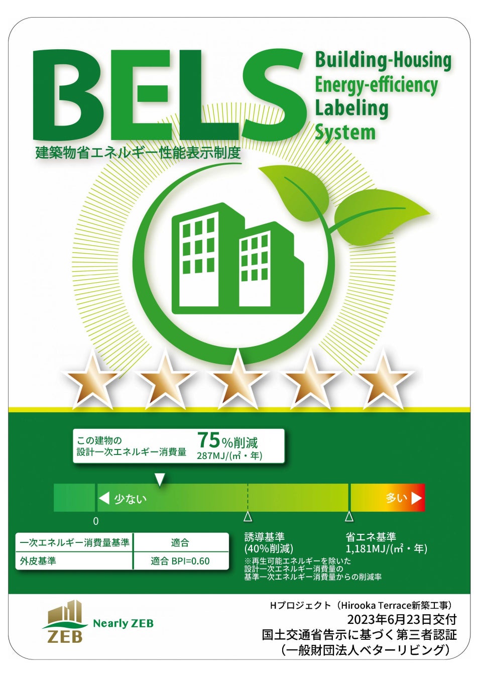 株式会社北國フィナンシャルホールディングス、株式会社三菱地所設計は、2025年7月の竣工を目指し、石川県金沢市にて建設が進むオフィスビル「Hirooka Terrace」(以下、本施設)が、建築物省エネ法に基づく第三者認証制度である「BELS」認定の最高評価(5つ星)ならびに「Nearly ZEB」を取得しましたのでお知らせします。