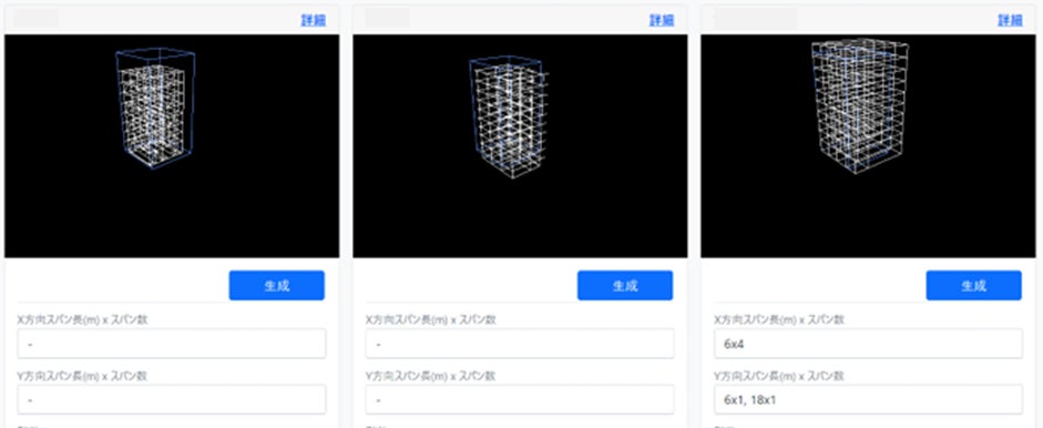 開発に当たっては、AIの学習データを整備するために、学習データ用の構造架構を自動生成するアルゴリズムを開発。15階以下(地下無し)、1方向最大10スパンという条件の下、様々なオフィスビルの規模・形状に応じた構造架構データを現時点で約1,500棟分生成済みです。