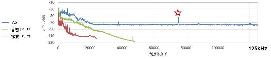 ・アコースティックセンサと振動センサは、同じ定常音(下グラフの☆印周波数付近:約1.2kHz, 2.5kHz, 5kHz, 6kHz)を収録していることを確認。