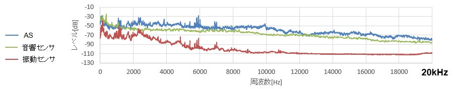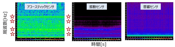 ・振動および音響センサでは検知できない超音波帯域のピーク音(波形)をアコースティックセンサだけが捉えており、測定可能な周波数帯域が広いことを確認。