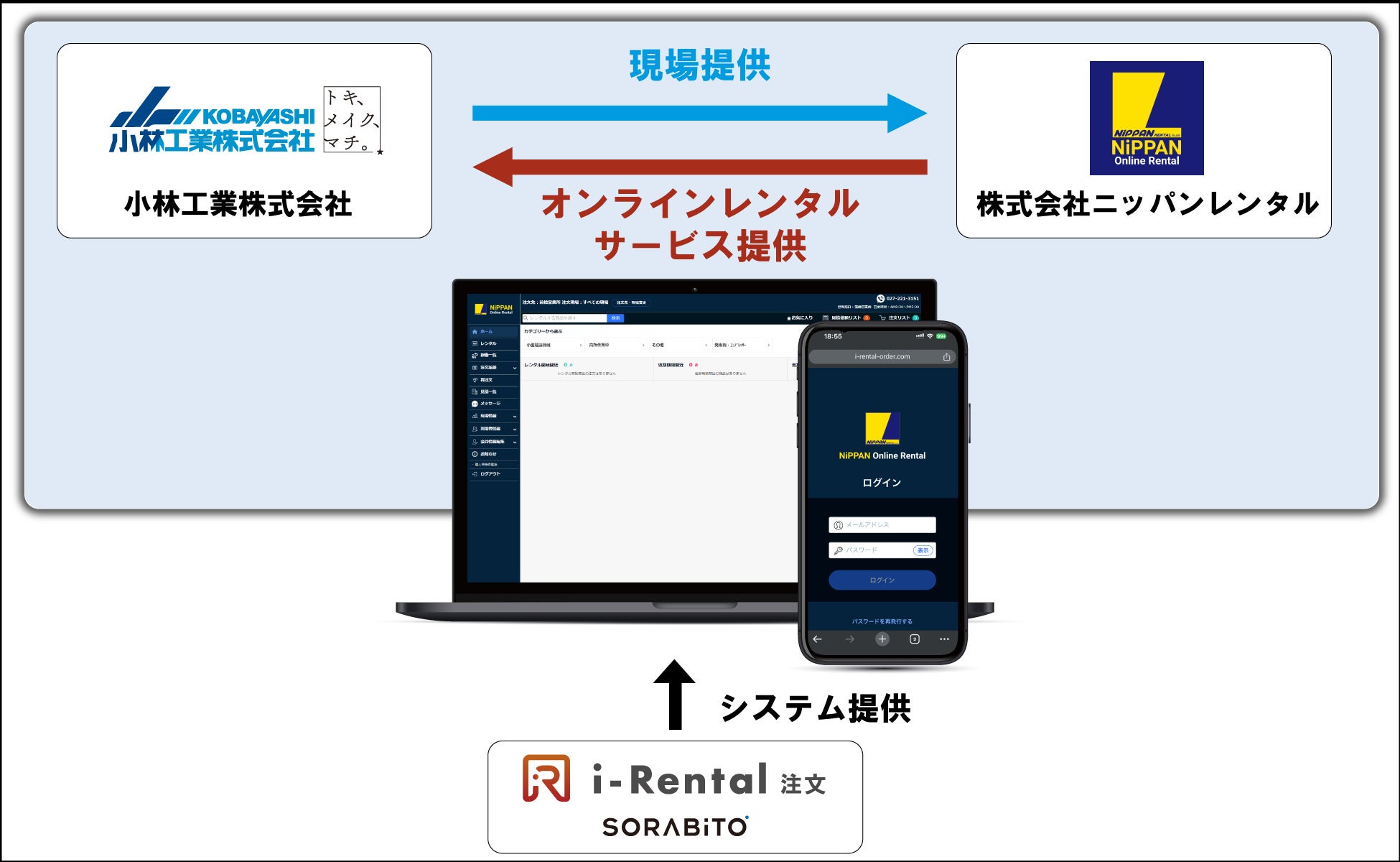 SORABITO株式会社(代表取締役:博多一晃、本社:東京都中央区、以下「SORABITO」)は、創業1880年(明治時代)より群馬県の地域づくりをリードしてきた小林工業株式会社(代表取締役社長:小林祐介、本社:群馬県前橋市、以下「小林工業」)と、株式会社ニッパンレンタル(代表取締役社長執行役員:石塚春彦、本社:群馬県前橋市、以下「ニッパンレンタル」)と共に、建機レンタルDX SaaSプロダクト「i-Rental 注文」を活用した実証実験を群馬で初めて開始しますことをお知らせいたします。