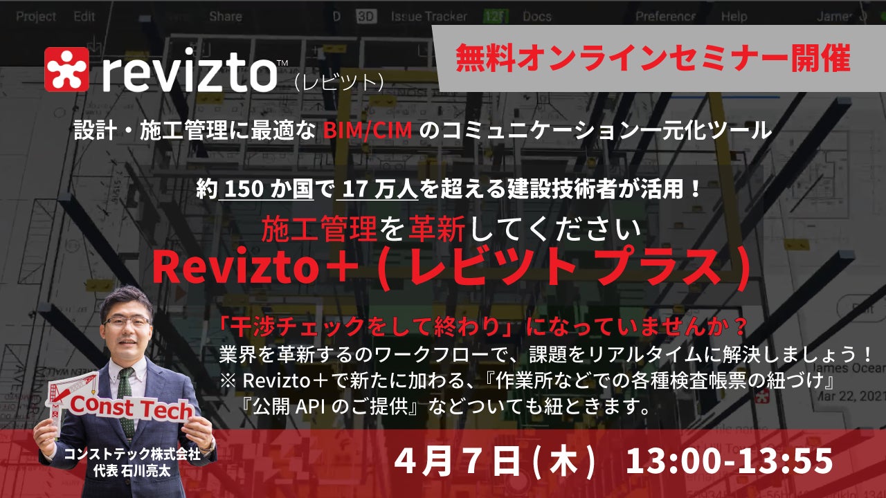 コンストテック(株)代表 石川亮太より、『Revizto+ (レビツト プラス)』の便利な活用を具体的お伝えし、参加者の皆様からのご質問にお答えいたします。