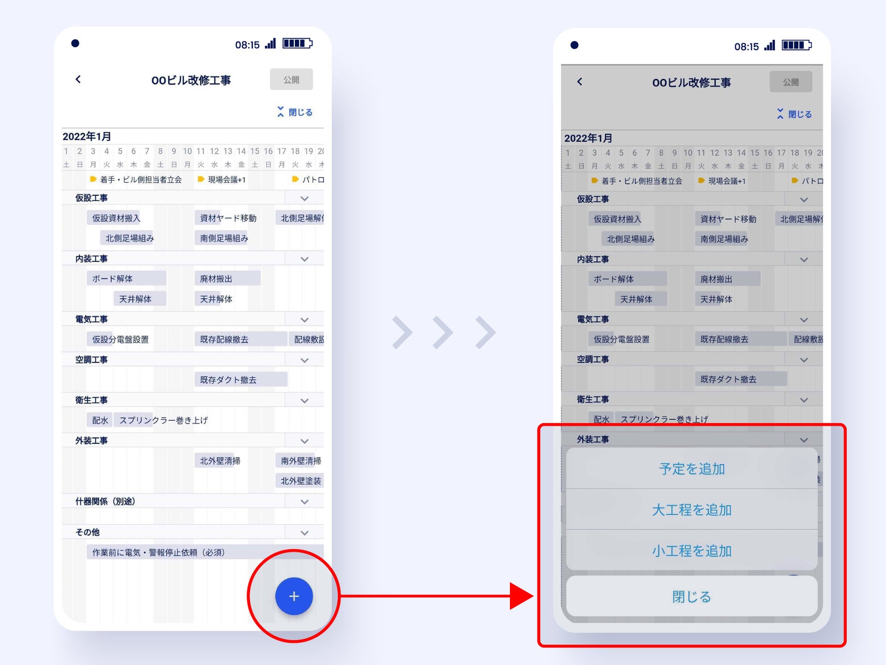 作成済み工程表の編集機能はWEB版でしかご利用いただけませんでしたが、アプリ版でも編集できるようになりました。パソコンが使えない現場や移動中などでも、スマートフォンから工程表を編集・共有できるようになり、利便性が向上しました。
