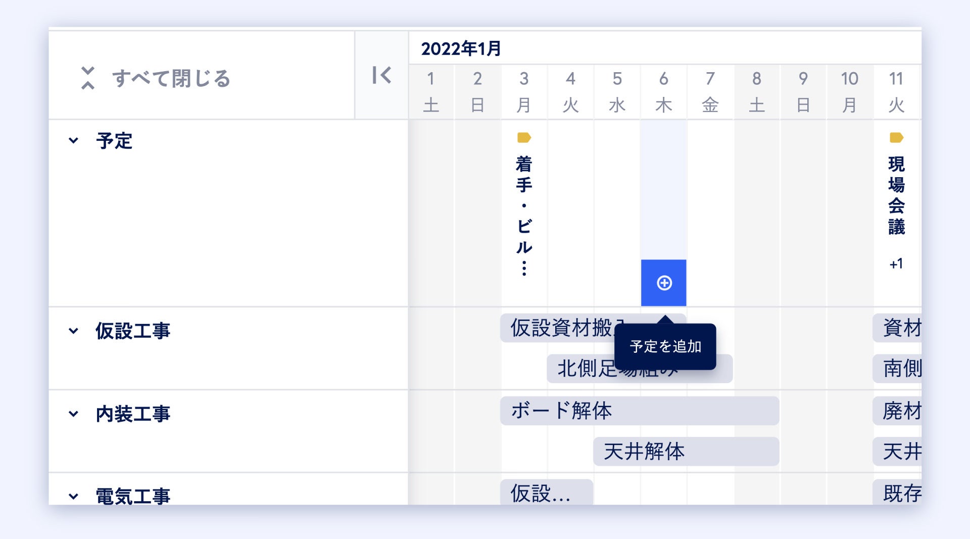 「工程表とカレンダーを両立させたい」というご要望から、新たに予定欄を追加しました。工程表上に重要な行事・検査など、工程に含まれない予定を追加することで、より現場全体のスケジュールを把握しやすくなります。
