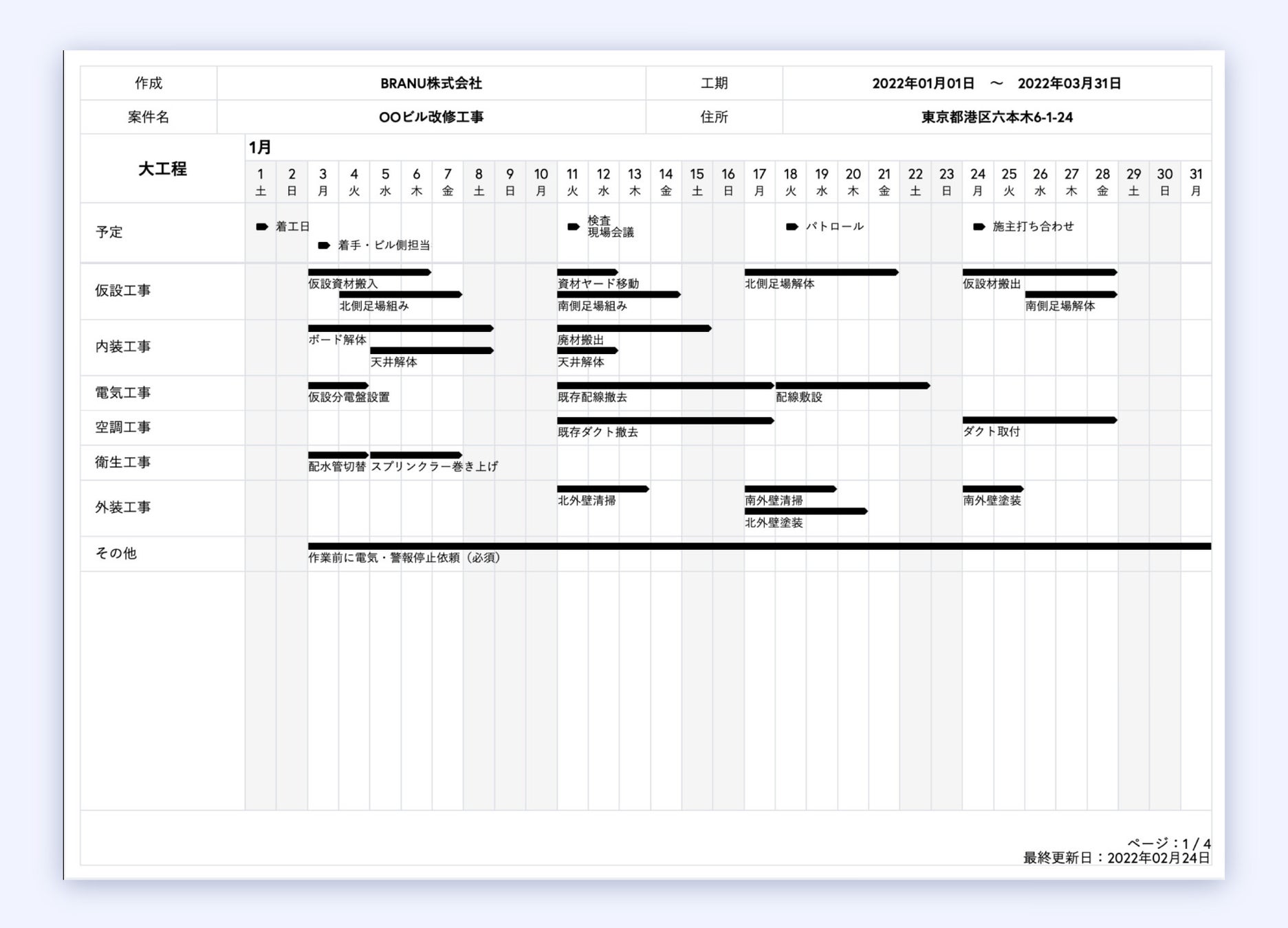 建設業界のDX(デジタルトランスフォーメーション)を目指すBRANU株式会社(本社:東京都港区 / 代表取締役CEO:名富達哉 / 以下ブラニュー)は、クラウド施工管理ツール「CAREECON for WORK 施工管理(https://work.careecon.jp/products/sekou) 」の工程表機能をリニューアル。2022年3月1日より提供を開始しました。
