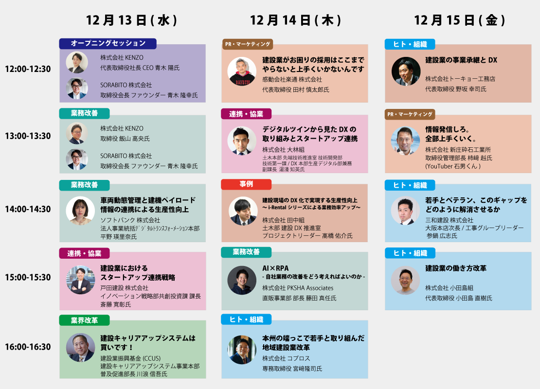 前回のCSPI展示会で好評だったブース内のセミナーに今回は14社の建設に関わる皆様に登壇いただきます。テーマは「建設業界課題」「自社DX&点検事例」「ヒト・組織づくり」「自社DX&注文事例」等様々な取組みをご紹介いただきます。