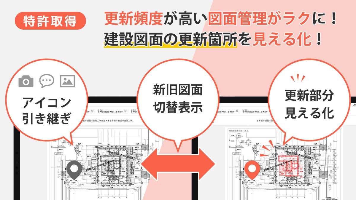 本発明は、「建設図面が更新された際に、自動で更新箇所を見える化し、更新前後の建設図面を切替表示したり、アイコン/メモ/写真などを引き継ぐことができる」技術です。