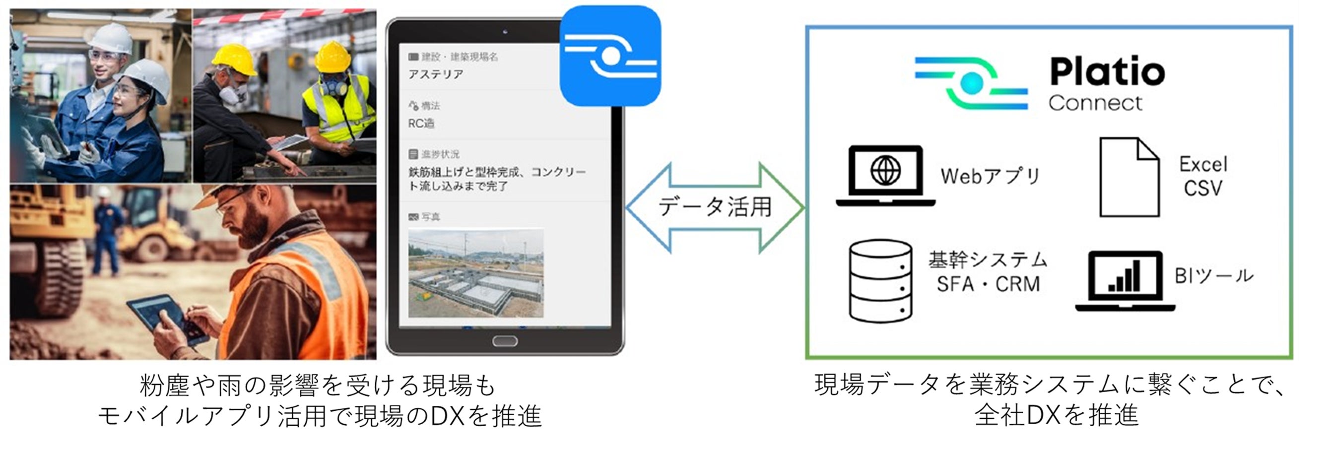 2022年にはアプリ作成・活用だけでなく、データ連携までをノーコードで実現できるPlatio Connectを発売。これにより、現場データと様々なシステムやサービスをシームレスに連携し、データ活用の支援もしています。