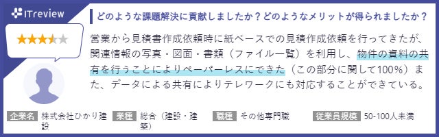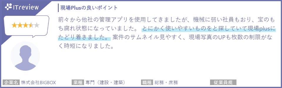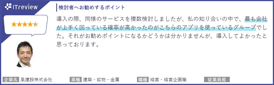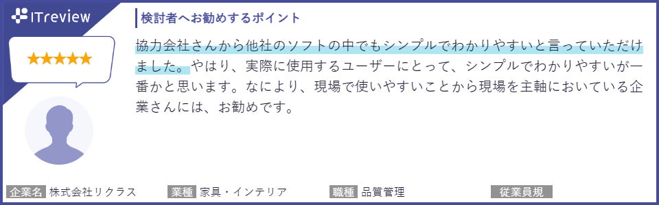 「ITreview」とは、アイティクラウド株式会社(本社:東京都港区、代表取締役社長:黒野 源太)が運営する国内最大級の法人向けレビューサイトです。8,200のIT製品とそれらに関するレビューを約11万件以上掲載しており、投稿されたレビューをもとに四半期に一度、ユーザーに支持された製品を「ITreview Grid Award」 で表彰しています。