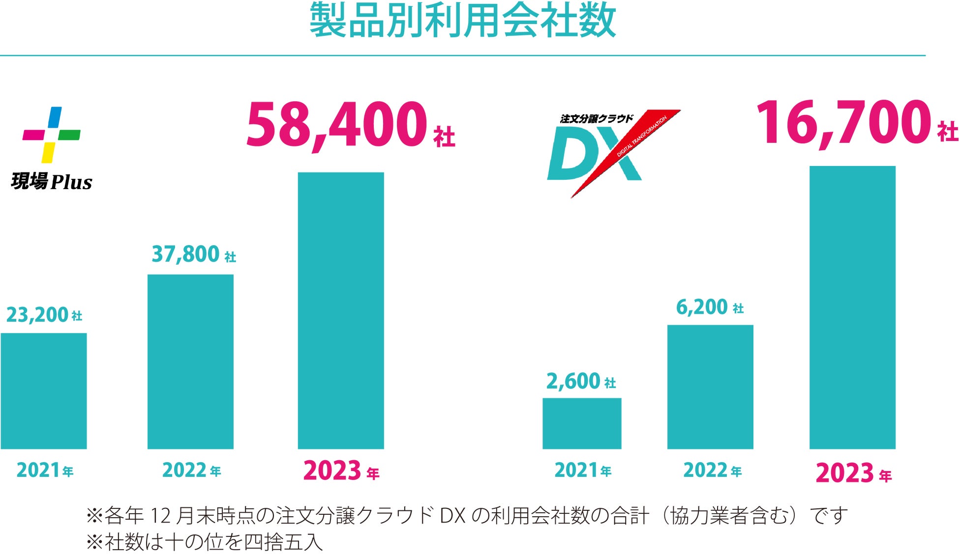 近年のDX推進やインボイス制度、電子帳簿保存法などを背景に、「現場Plus」、「注文分譲クラウドDX」ともに利用会社数が急増しております。また建設業の時間外労働の上限規制も今年の4月に迫り、労働環境の改善が喫緊の課題となっている今、さらなる利用会社数の拡大が見込まれています。