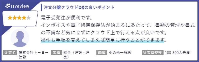 「注文分譲クラウドDX」は顧客管理から見積もり、発注、引き渡し後の点検予定まで全て一元管理できる、住宅会社向けの基幹業務システムです。すべてのデータをクラウド上で一元化することで、業務効率向上に貢献します。特にご好評をいただいているタイムスタンプ不要の電子受発注機能は、公益社団法人日本文書情報マネジメント協会(JIIMA)が認証する「電子取引ソフト法的要件認証」を取得しており、電子帳簿保存法への対応も万全です。