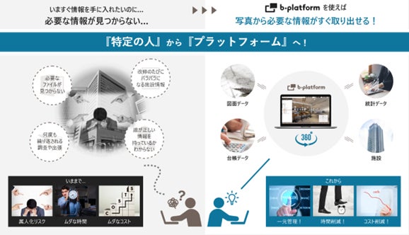 『b-platform』は、竣工図や改修図面などの各種図書や改修・工事履歴、不具合情報、保守記録といった社内に散らばる情報を一元管理し、知財に変えるためのクラウド型プラットフォームサービスです。クラウド上に建物の「分身」をつくり、360度写真ストリートビューで様々な情報を「見える化」することで、必要な情報に瞬時にアクセスでき、部署や拠点の垣根を超えた情報共有が可能なポータルサイトに育てていくことができます。