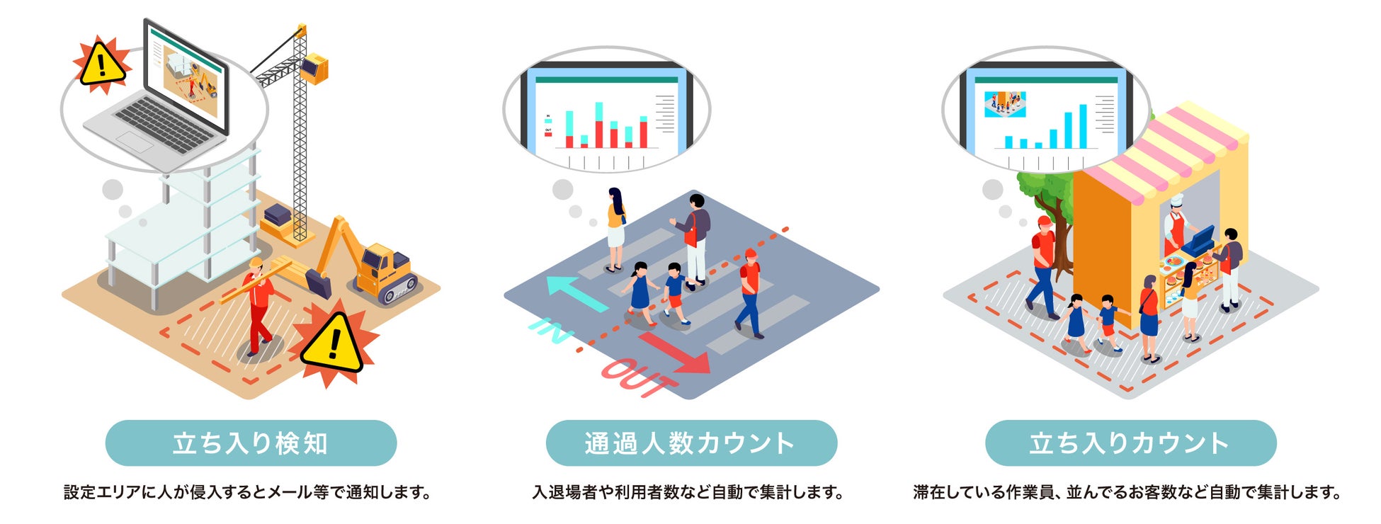 建設現場では特定エリアに人物が侵入したことを検知・通知することによって、資材の盗難防止や安全管理に役立てることができ、公共空間ではカメラ映像内の往来人数を計測することによって、対象エリアの人の流れを定量的に把握しイベント企画やまちづくりの検討などへ役立てることが可能です。