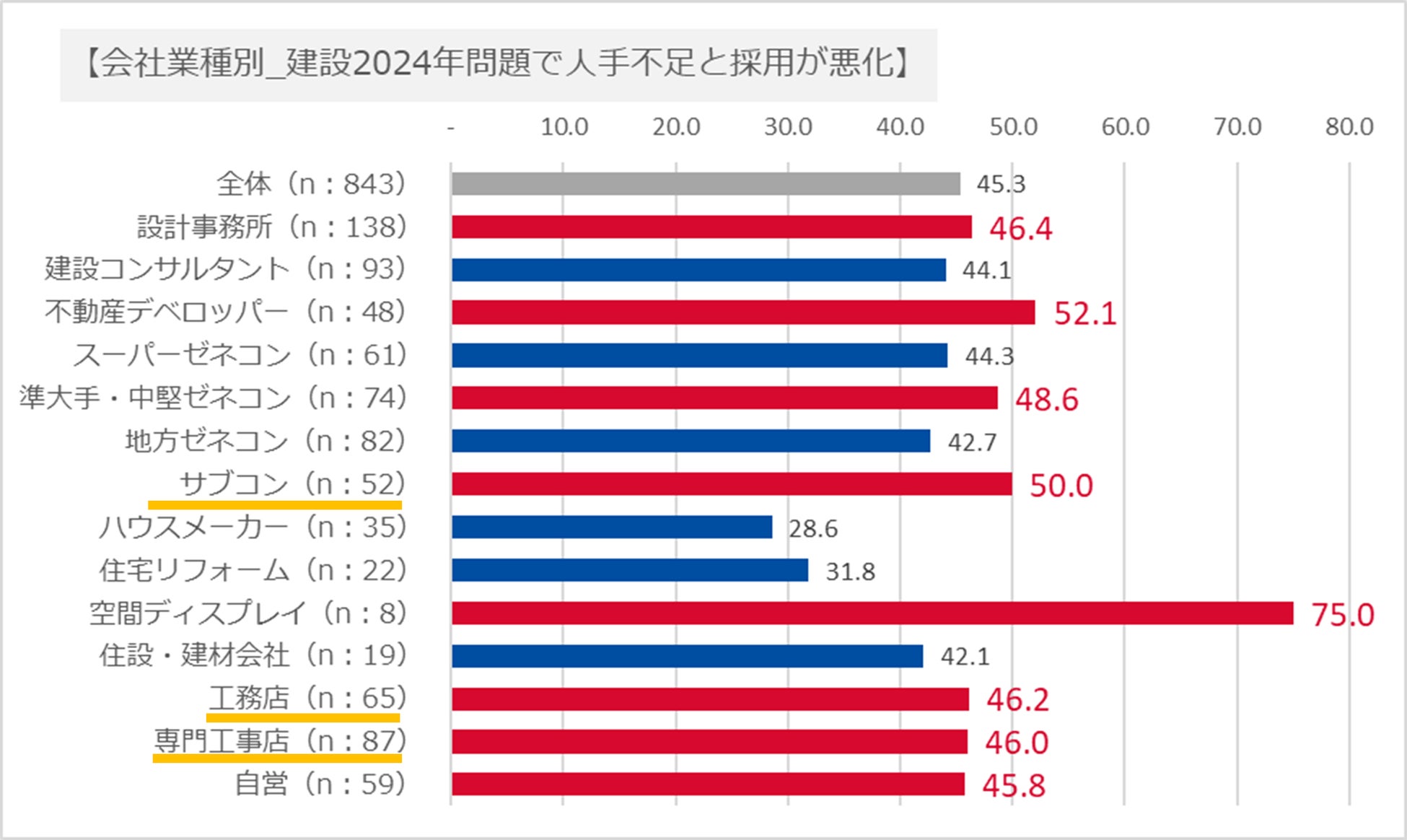 4-3.会社業種別に、「悪くなっていくと思う」との回答割合に注目したところ、現場に近い事業内容の会社(サブコン、工務店、専門工事店)ほど、その割合が多くなる傾向にあることが分かった。