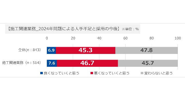 4-2.人手不足が深刻と言われている、建設現場での施工関連業務の従事者(施工管理、施工、専門工事)に注目してみてみたところ、2024年問題による人手不足と採用状況が「悪くなっていくと思う(46.7%)」が全体のそれよりも割合が高い結果であった。