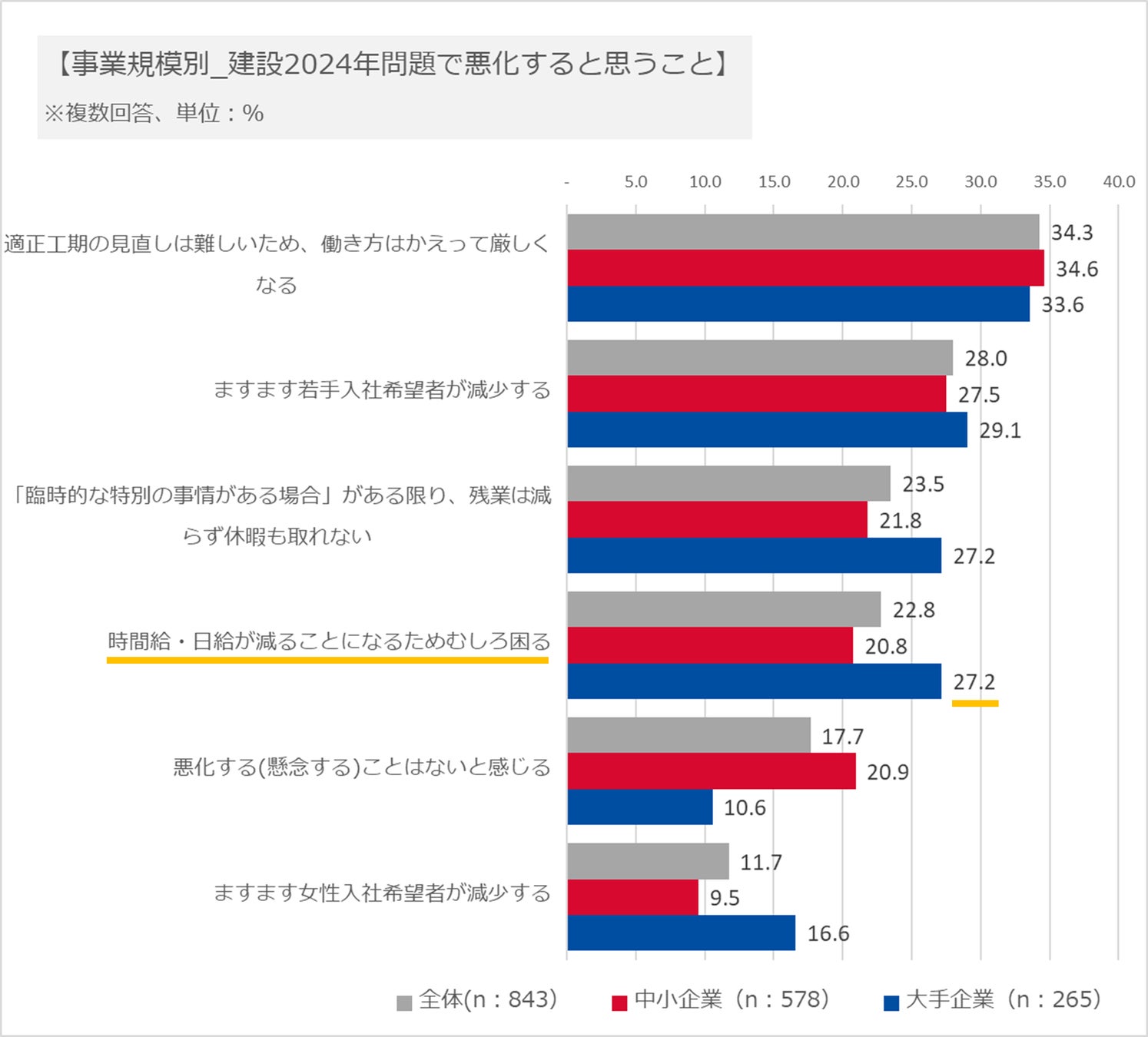 2.【建設2024年問題で悪化すると思うこと(複数回答)】建設2024年問題を「詳しく把握している」または「聞いたことがあるが詳細まで把握していない」と回答した方(n:843)に「建設2024年問題で悪化すると思うこと(複数回答)」を尋ねたところ、企業規模に関わらず、1位は「適正工期の見直しは難しいため、働き方はかえって厳しくなる」であった。