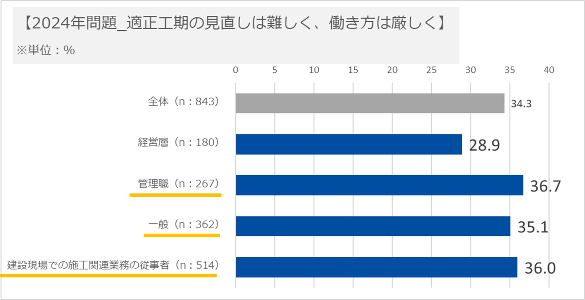 2-2.「適正工期の見直しは難しいため、働き方はかえって厳しくなる」との懸念は、経営層(28.9%)よりも管理職(36.7%)・一般職(35.1%)の方が強く、建設現場での施工関連業務の従事者(施工管理、施工、専門工事)では36.0%との結果となった。