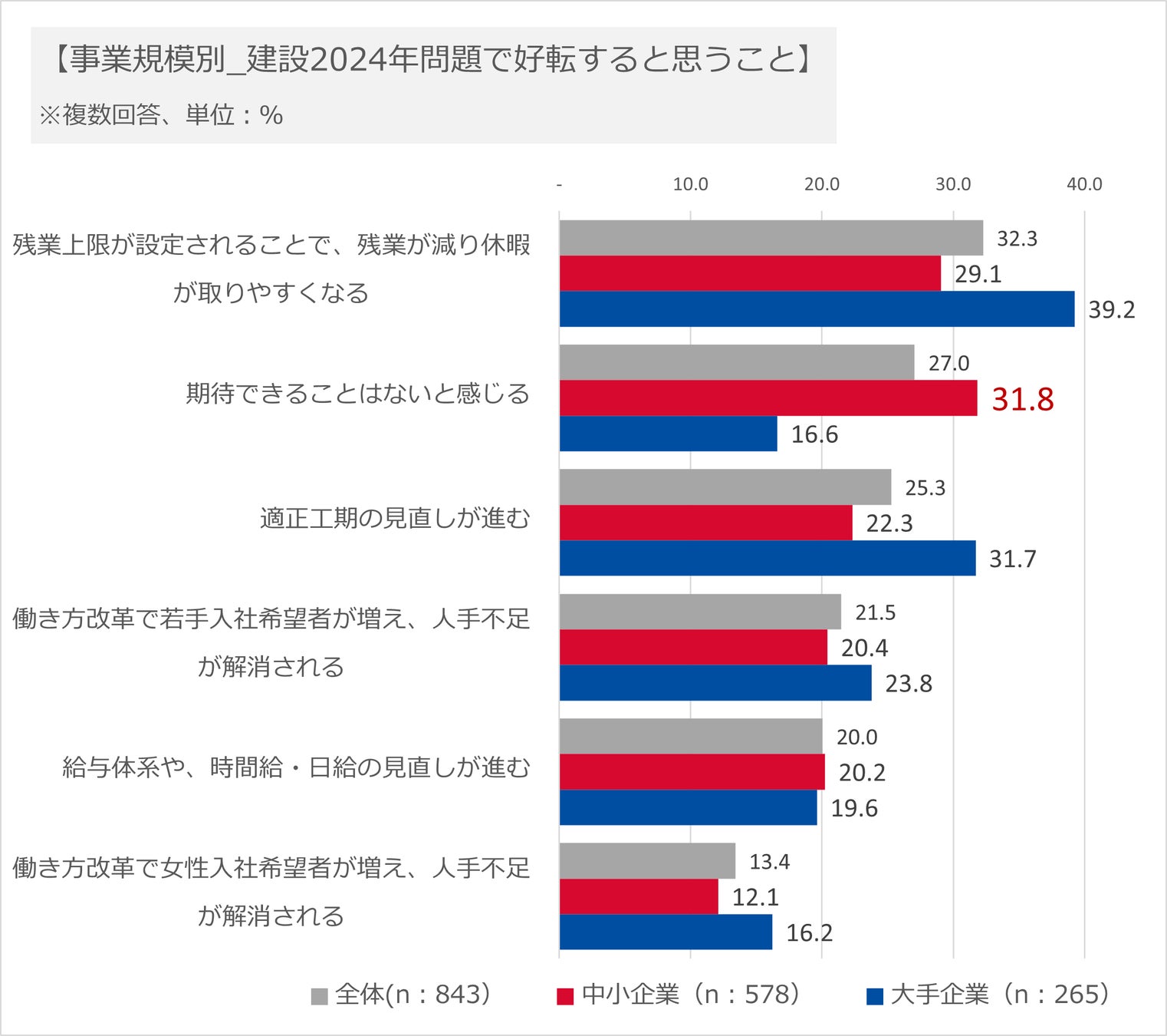 3.【建設2024年問題で好転すると思うこと(複数回答)】建設2024年問題を「詳しく把握している」または「聞いたことがあるが詳細まで把握していない」と回答した方(n:843)に「建設2024年問題で好転すると思うこと(複数回答)」を尋ねたところ、次表の通りの結果となった。中小企業では、1位に「期待できることはないと感じる(31.8%)」が上がっている点に注目したい。