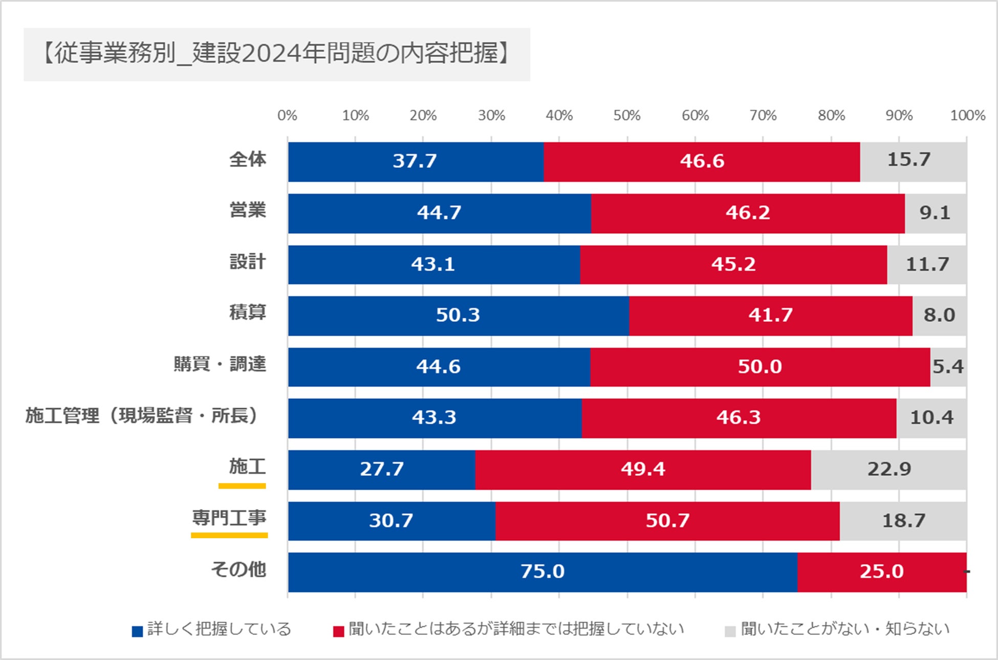 1-1.従事業務別にみると、施工、専門工事に従事する方の「建設2024年問題」の認知状況が芳しくないことが分かった。