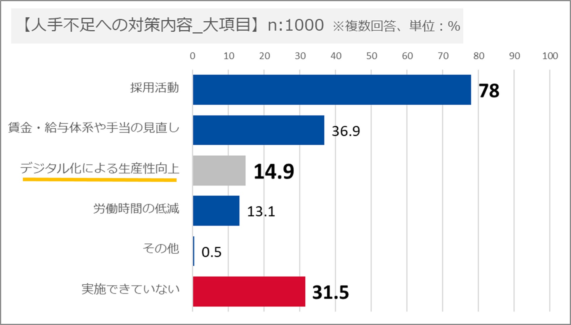 5-1.結果を総じてみてみると、「人手不足対策」は「採用活動(78%)」が最多であり、「デジタル化(ICT導入・DX化の導入推進)による生産性の向上(14.9%)」は進んでいないことが分かる。