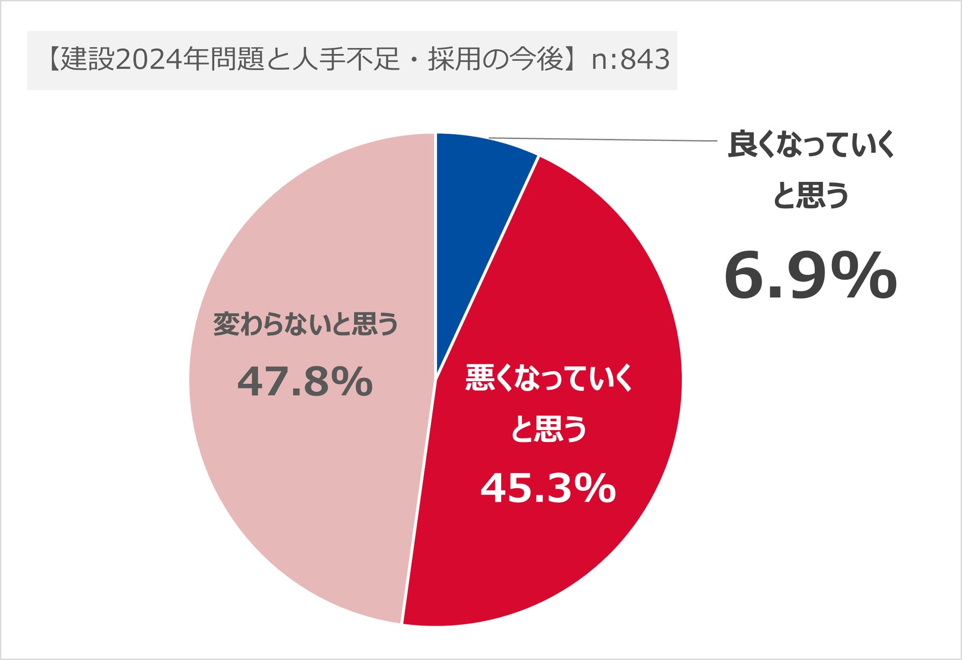 4.【建設2024年問題と人手不足・採用の今後】建設2024年問題の内容を「詳しく知っている」「聞いたことはあるが詳細までは把握していない」と回答した方(n:843)に、「建設2024年問題対応が始まることで、人手不足・人材採用の状況が変化すると思いますか」と尋ねたところ、「人手不足と採用の改善」に期待するのは6.9%と、1割にも満たない結果となった。