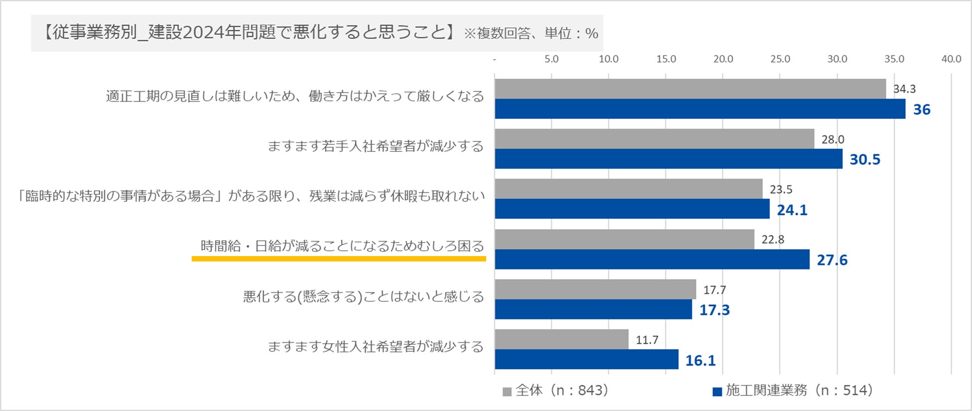2)従事業務別では、建設現場での施工関連業務の従事者(施工管理、施工、専門工事)において1位、2位は全体と同じ項目がランクイン(比率はいずれも全体よりも多い)、3位「時間給・日給が減ることになるためむしろ困る(27.6%)」となった。