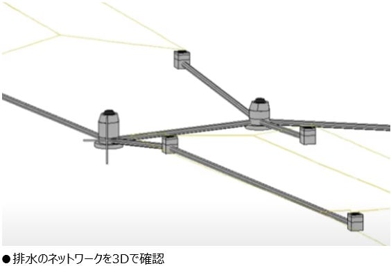 - 集水桝や側溝、暗渠等の排水系統の計画や付随する構造物を3Dモデル空間で作成が可能です。