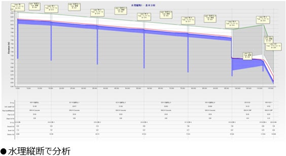 - 降雨データを入力し、ネットワークの解析が可能です。流量や流速、水位等の分析を行うことが可能です。