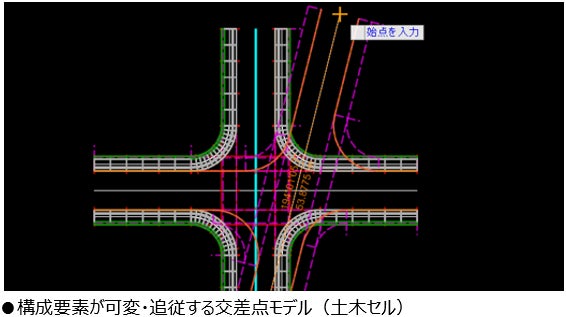 - “土木セル”とは、様々な要素を1つのユニットとしてテンプレート化したもので、道路の交差状態などに応じて構成する各要素が可変、追従する3Dの設計パーツです。