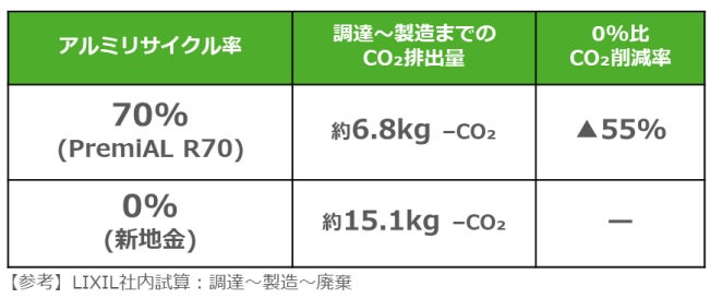 ※1 原材料として新地金を使用すると、地金の調達から材料製造までの工程で排出されるCO2量は約15.1㎏-CO2であるのに対し、原材料の70%にリサイクルアルミを使用した場合、新地金の調達から材料製造までの工程で排出されるCO2量は約6.8㎏-CO2(55%削減)となる。